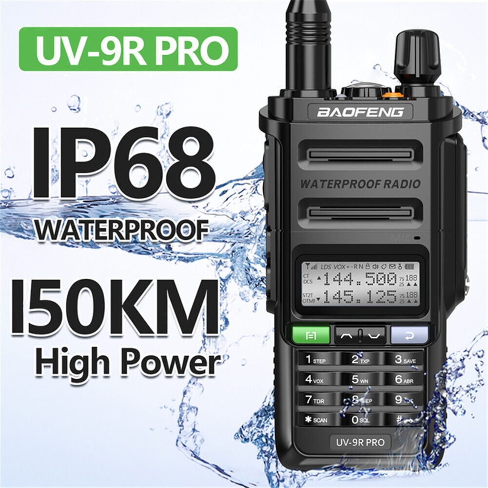 The BAOFENG UV-9R Pro 8W Ham Radio is a long-range, dual-band, waterproof handheld transceiver ideal for outdoor activities like camping and hunting Product Description: Baofeng UV-9R PRO Upgraded Dual Band Waterproof High Power Walkie Talkie Communications Amateur Vhf Uhf CB Ham Radio Upgraded Version of UV-9R PLUS Product Characteristics: 【IP67 Waterproof Features】9R Plus upgrade version,The Two Way Radio with better waterproof and dustproof capabilities (Not diving),can be submerged in 5 feet / 1.5 meters of water for 30 minutes.