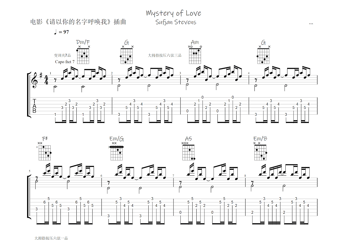 [In Key G, capo 0fret] Mystery of Love Chords by Sufjan Stevens: D, Em, C, Bm, G G G/A G/B G/D G/B D/A C Blessed be the mystery of love [Interlude 1] C G/B D (x4) C D Em/B D [Verse 2] C D Lord, I no longer believe Em/B D Drowned in living waters C D Cursed by the love that I received Em/B D From my brother's daughter C D Like Hephaestion, who died Em/B D Alexander's lover C D Now my riverbed has dried Em/B D Shall I find no